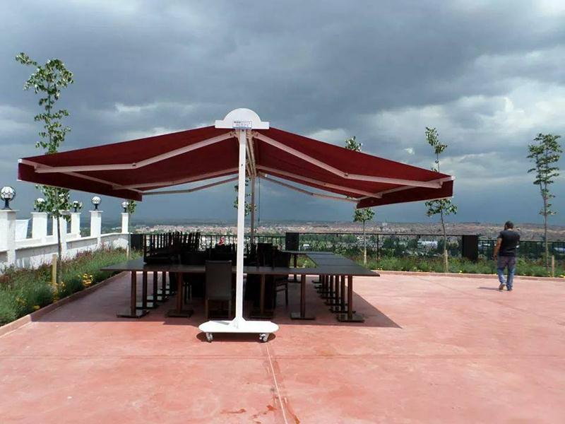 Çift Açılır Tente Büyük Mekanlar İçin. Büyük bir mekanınınız varsa ve en ekonomik çözümü düşünüyorsanız, mutlaka değerendirilecek bir alternatif olacaktır. Ayarlanabilir mafsallar sayesinde gölge alanını boyuna ayarlayabilirsiniz. İlk bakışta bir çok mafsallı tentenin yanyana durduğu imajını verebilir. Fakat şöyle düşünürseniz üç metre sağa, üç metre sola ve altı metre de uzunlamasına yapılabilmektedir. Yani yaklaşık otuzaltı metrekare alanı yağmur ve güneşten koruyabilmektedir. Güneş ışıklarının geliş açısı bu değerleri olumsuz yönde etkileyebilir.